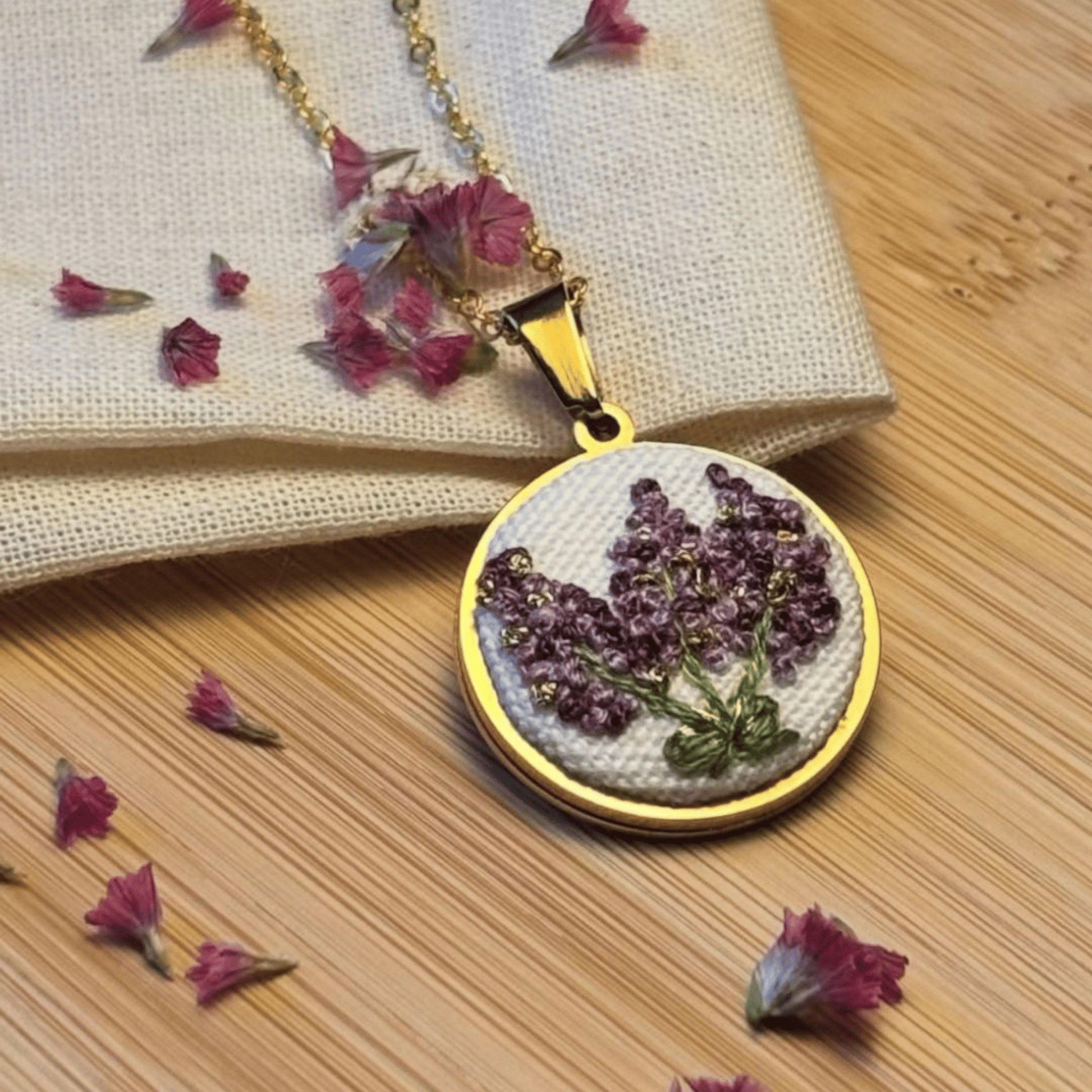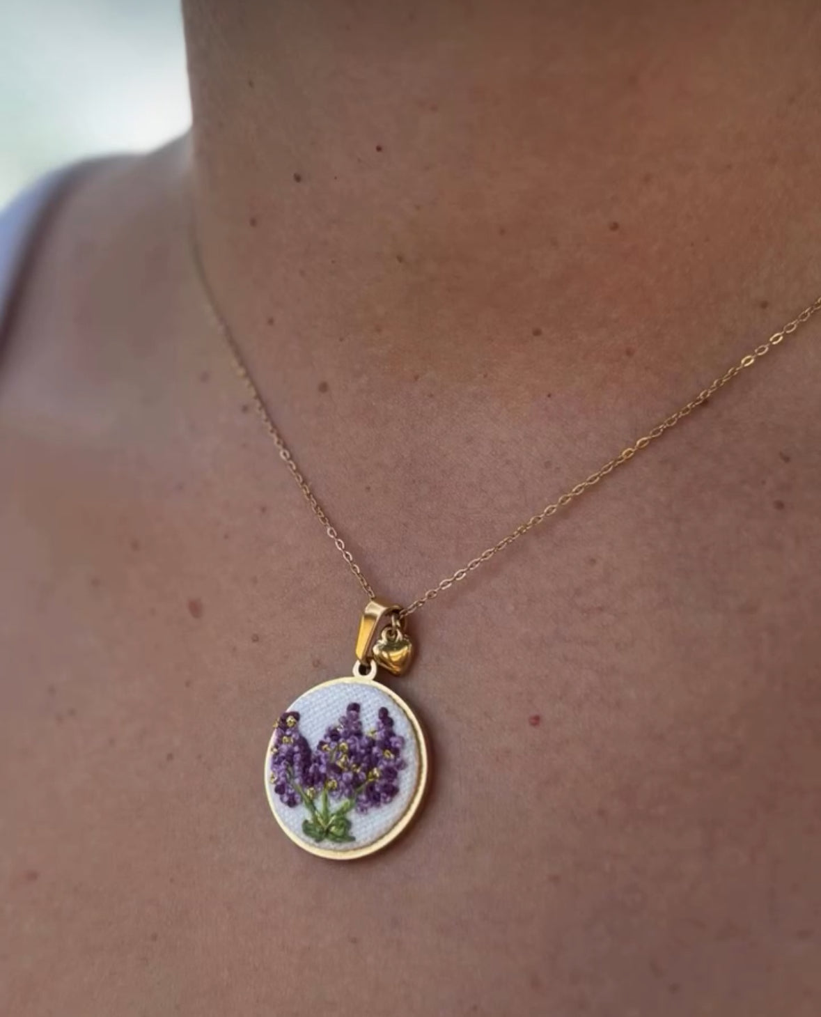Sinta a serenidade da natureza neste pendente feito à mão. A alfazema, com os seus tons suaves de lilás e roxo, é o símbolo da calma e do bem-estar, e foi cuidadosamente bordada em miniatura.
