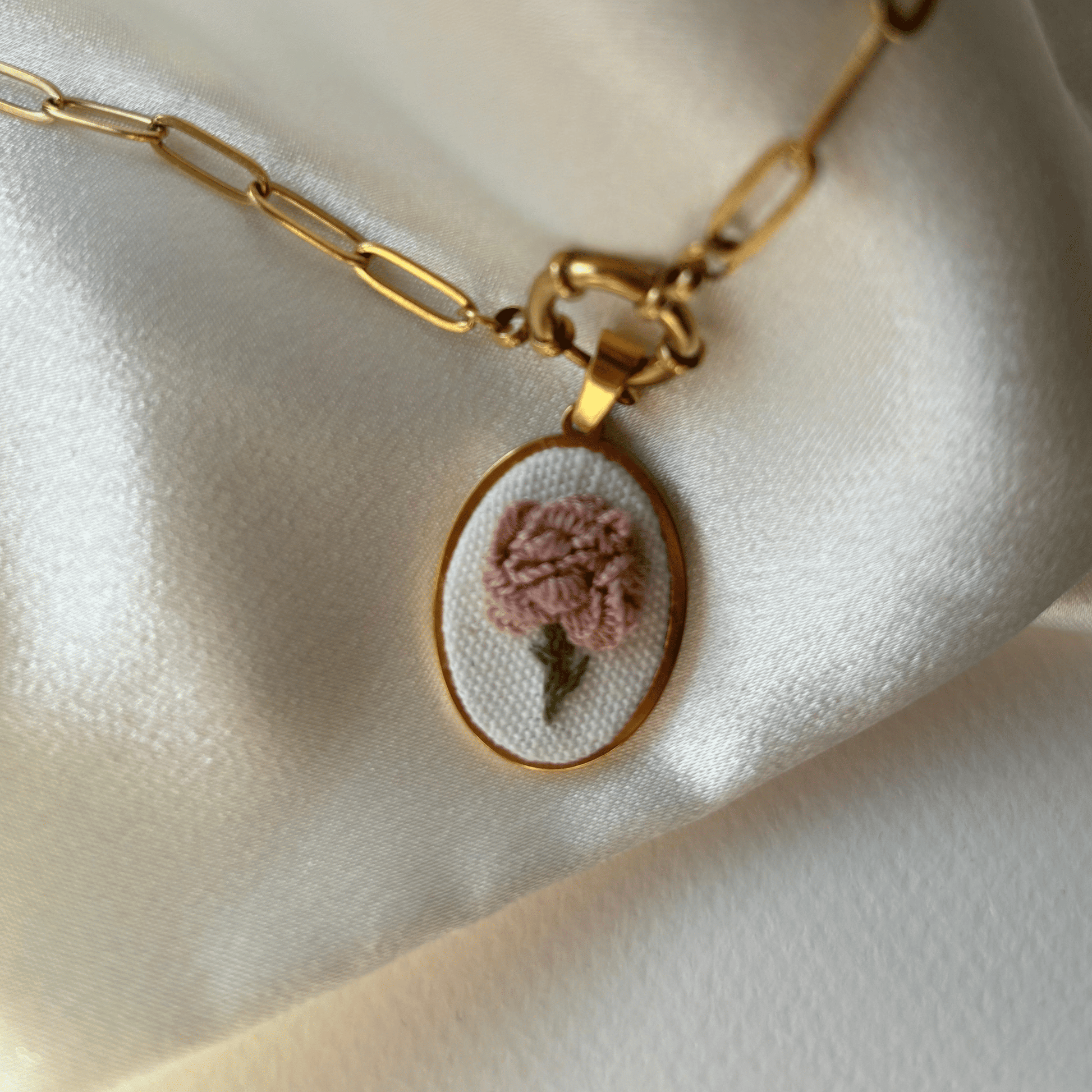 Mais do que uma joia, esta peça artesanal é uma celebração da delicadeza e da força feminina. O cravo rosa simboliza o amor suave, a admiração e a gratidão — sentimentos que florescem em cada ponto deste bordado feito à mão.