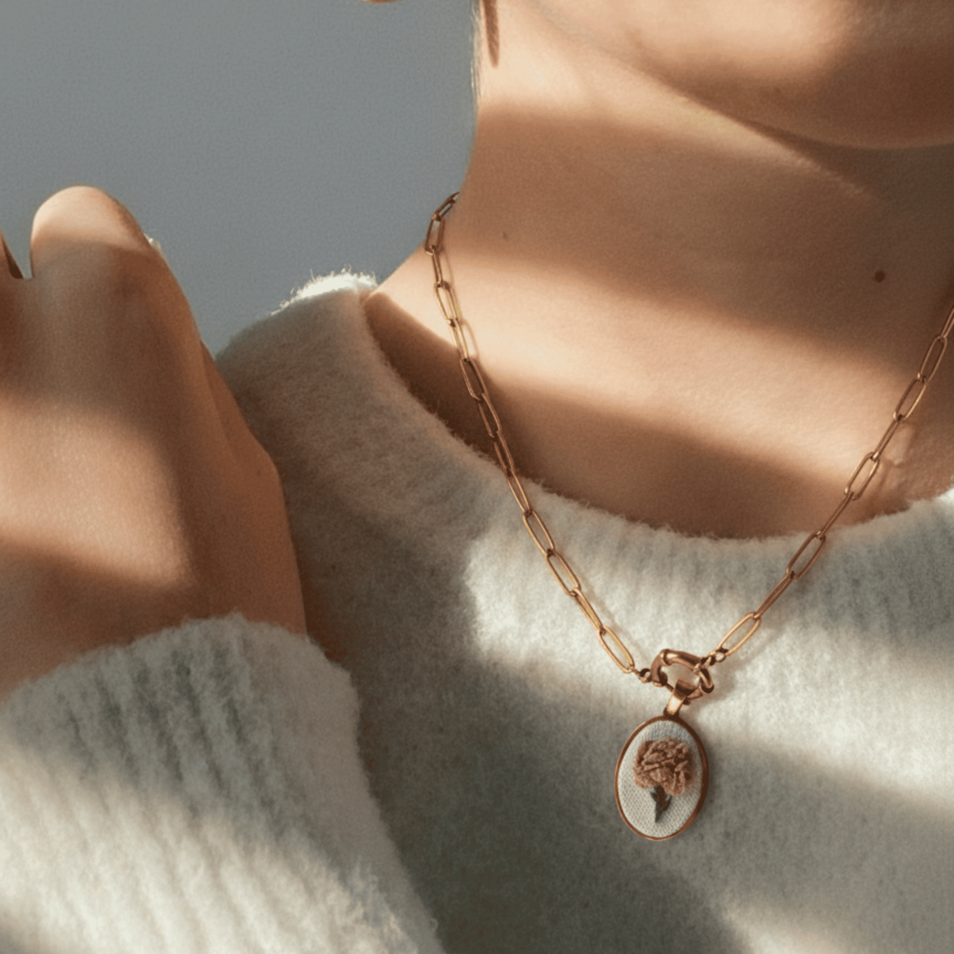 O pendente e a corrente são em bronze banhado a ouro 24k, conferindo brilho e elegância a uma peça única e intemporal.